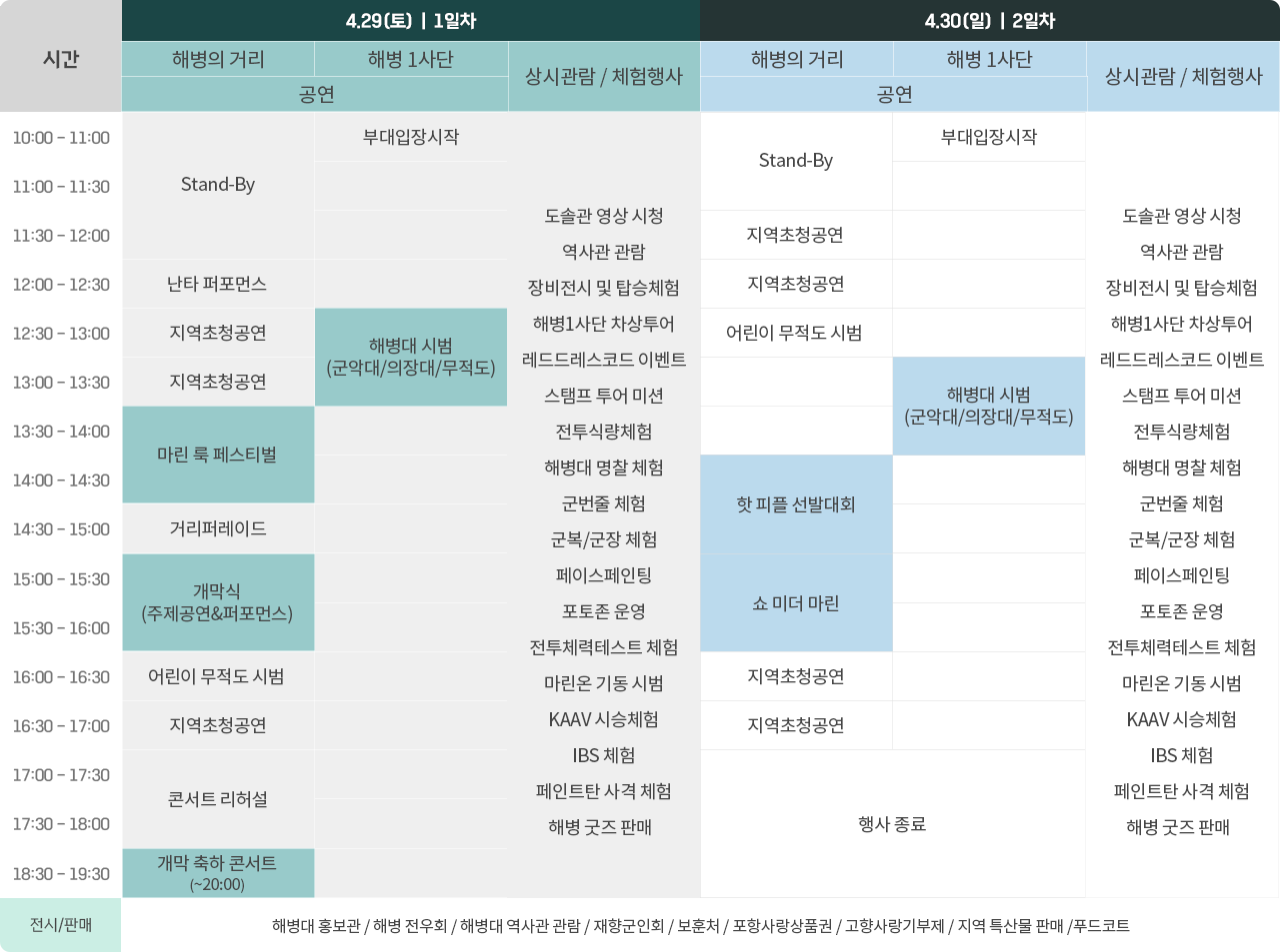 축제 첫날인 29일에는 개막식과 레드마린 드림콘서트, 마린룩 페스티벌, 해병대 축하 시범(군악대/무적도/의장대)이 진행됩니다. 이어 둘째 날인 30일에는 핫피플 선발대회와 해병힙합경연대회가 열릴 예정입니다.